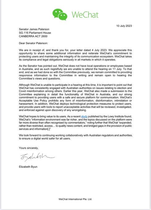 He said @WeChatApp & its parent company @TencentGlobal had been repeatedly invited to appear before the Senate Select Committee on Foreign Interference Through Social Media, & repeatedly declined. Their refusal to engage with the parliament reflects very poorly.