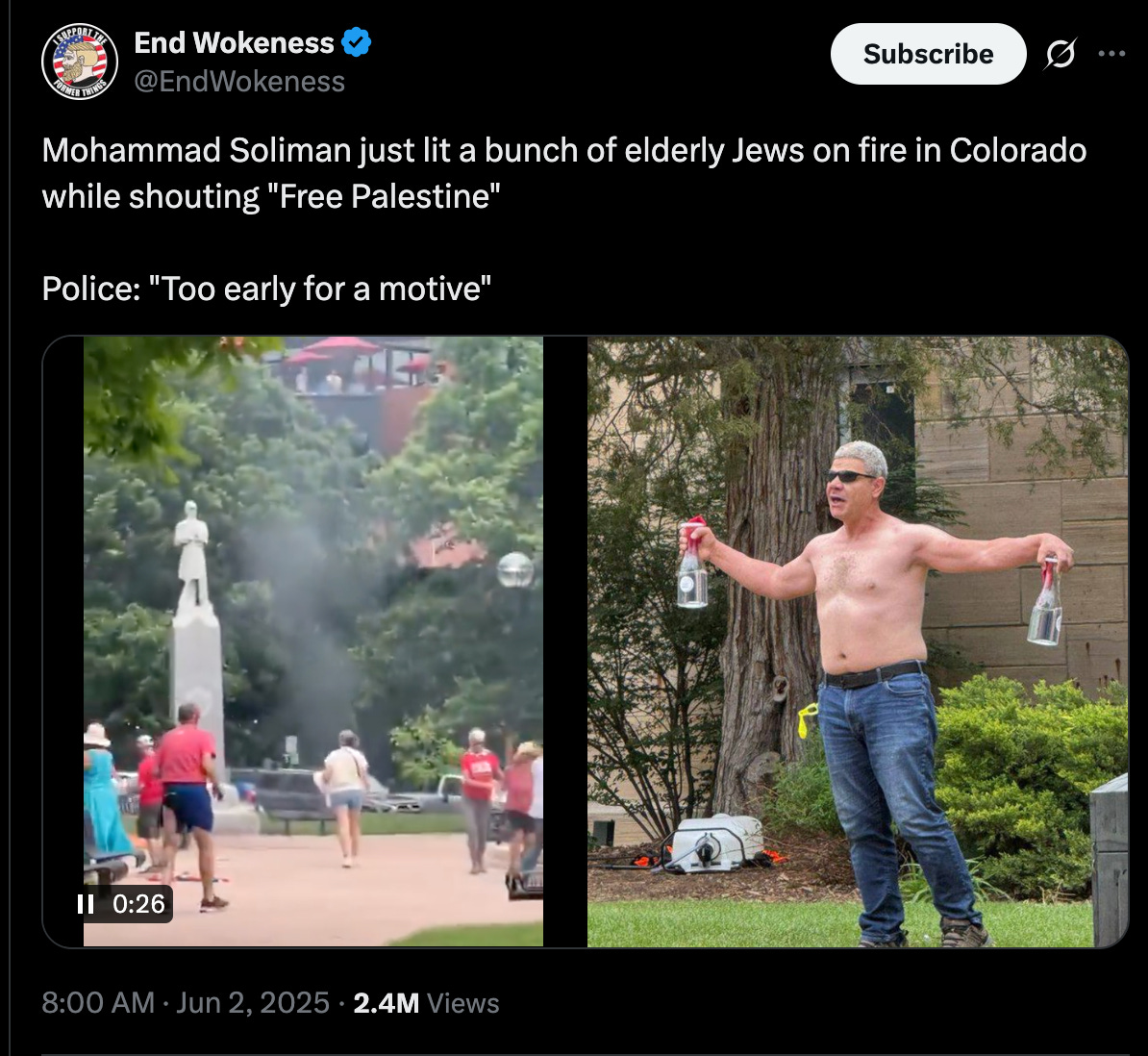 "The victim who is most deeply burned and has the worst burns was an older woman," said Miri Kornfeld, a Denver-based leader of Run For Their Lives in Skynews Afternoon Agenda Interview, "Unfortunately, when the terrorist, after saying Free Palestine and after saying slurs against Zionists and the Jewish people, launched his Molotov cocktail to the group, unfortunately, her clothing caught fire."