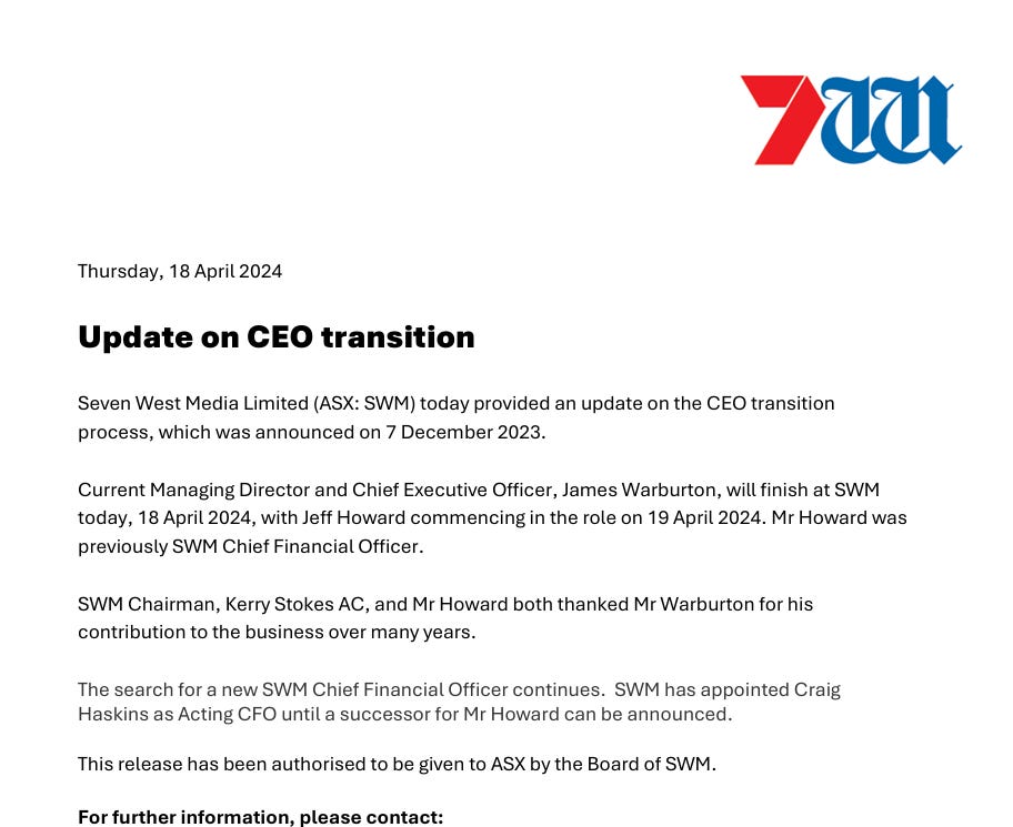 In a stock exchange announcement, Kerry Stokes, chairman of Seven West, expressed gratitude to Warburton for his contributions to the company.