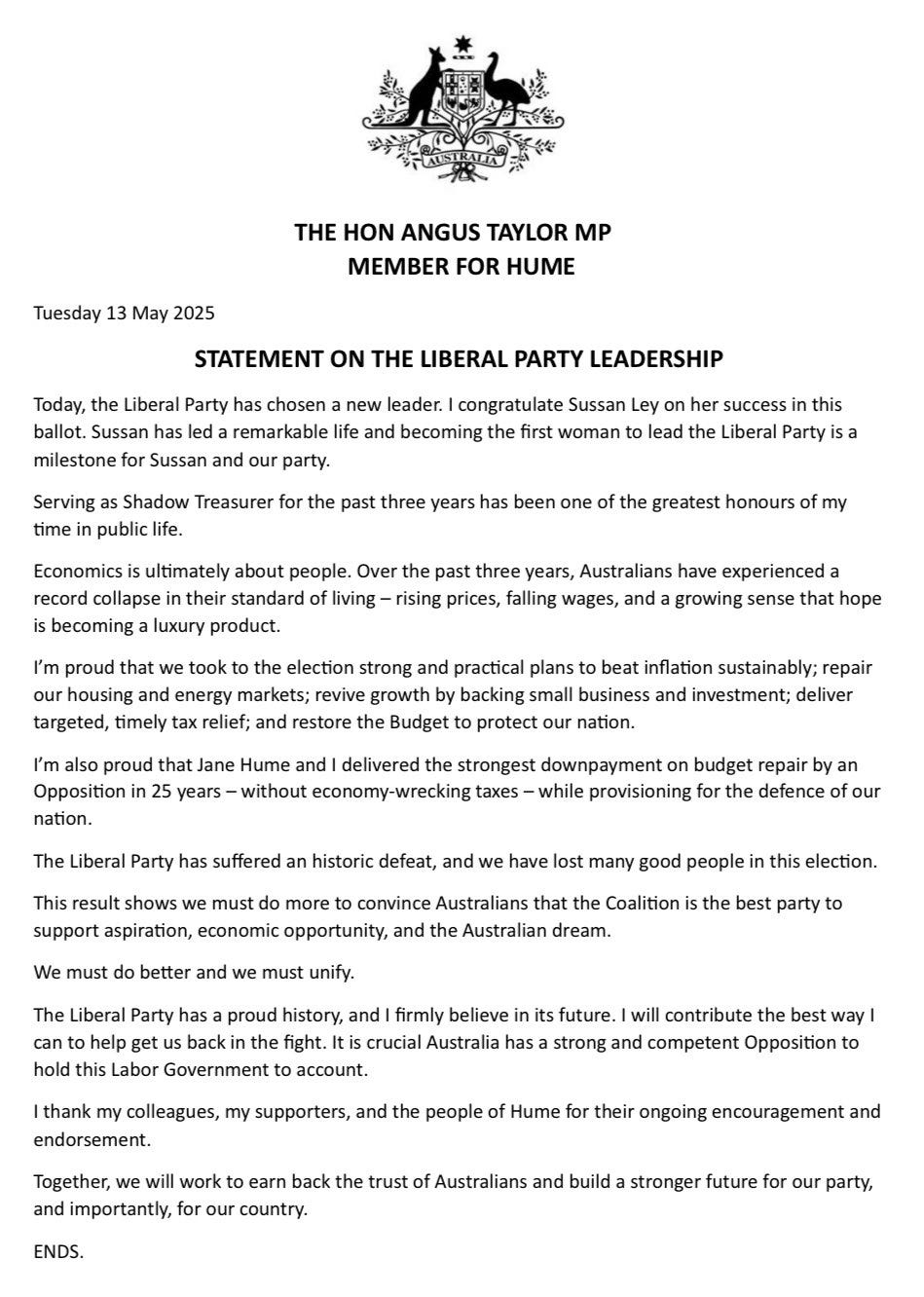 After narrowly losing his bid to lead the Liberal party to Sussan Ley, federal member for Hume, Angus Taylor, has released a statement. Congratulating Ley on her ballot performance, he called it a "milestone."