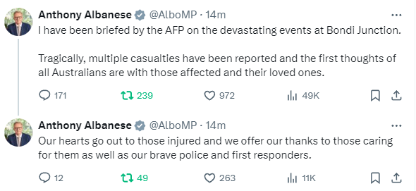 The opposition leader of Australia, Peter Dutton, has expressed his condolences to the victims. On X and Twitter, he wrote: