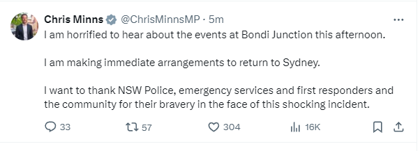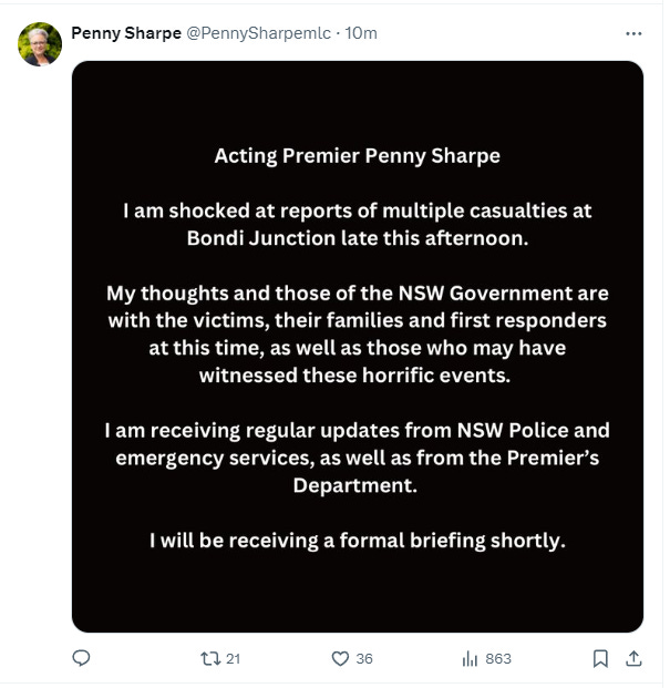 Australians will be in shock this evening at the tragic and terrifying events which have taken place at Westfield Bondi Junction.