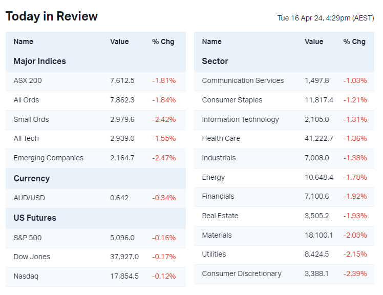 S&P/ASX 200 (XJO) closed 140 points lower at 7,612.5, down 1.84% from its session high and 0.35% from its low. In the S&P/ASX 300 (XKO), advancers trailed decliners by 16 to 277.