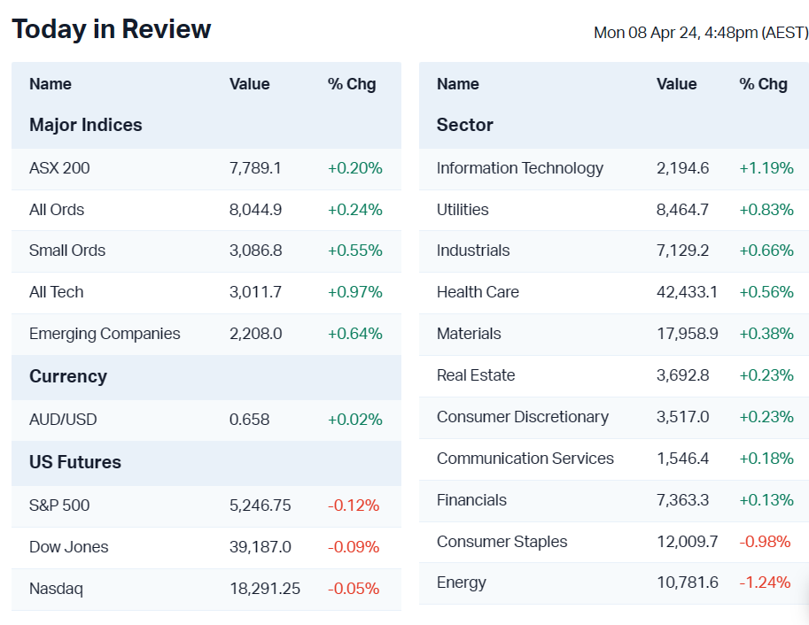 The S&P/ASX 200 closed 15.8 points higher, up 0.20%.