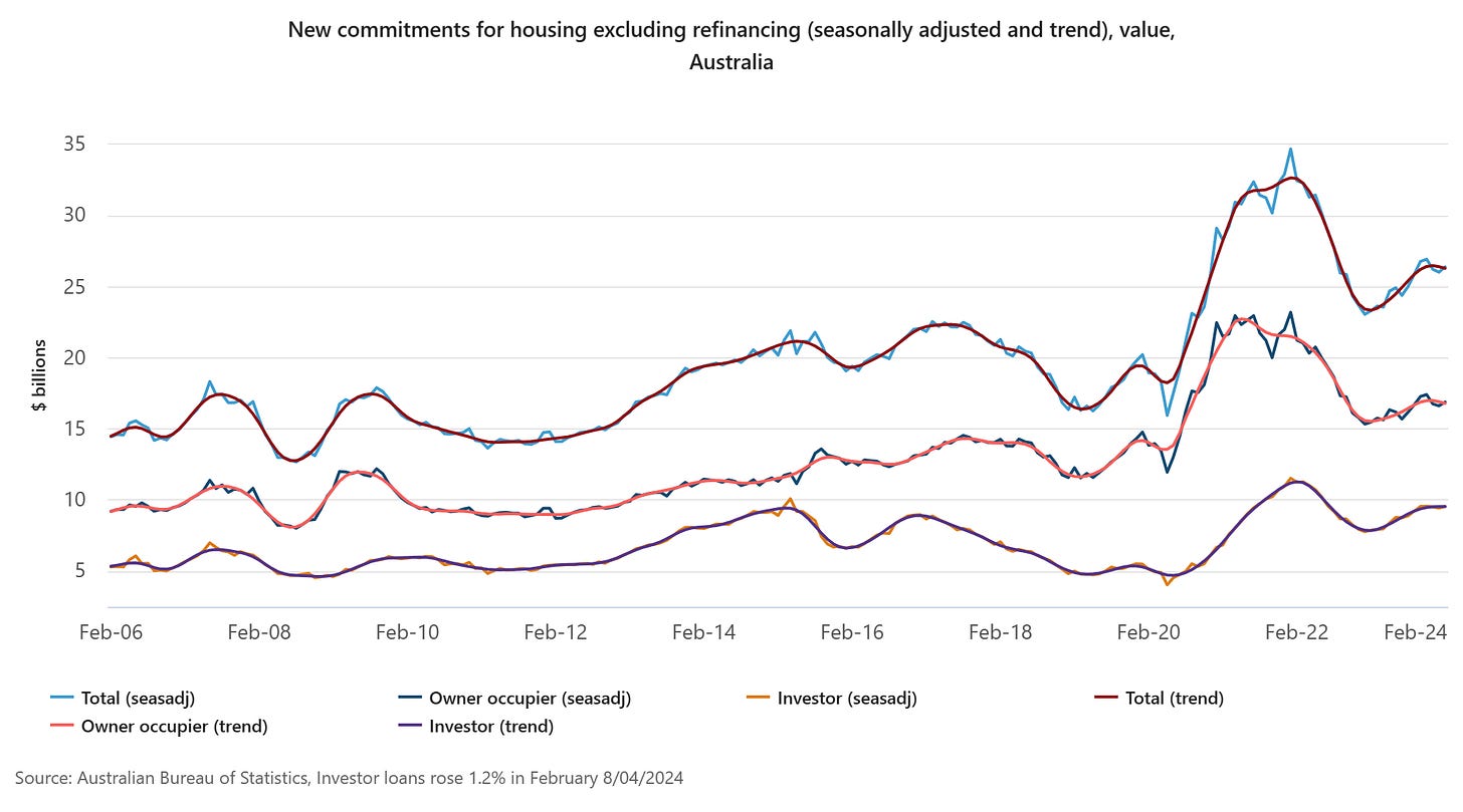 The Australian Bureau of Statistics (ABS) today released data showing that in February 2024, the total value of new housing loans to investors increased by 1.2%.[Read more]