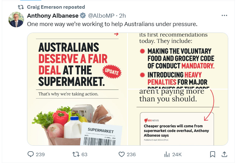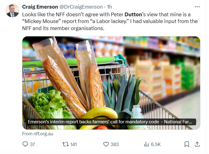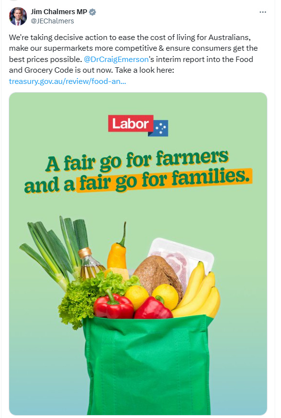 Dr Emerson’s support for making the Code mandatory was shared by the ACCC, former ACCC Chairs Rod Sims and Allan Fels, the National Farmers’ Federation, AUSVEG, Australian Dairy Farmers, the Australia Chicken Growers’ Council, Fresh Markets Australia, and 16 other stakeholders.