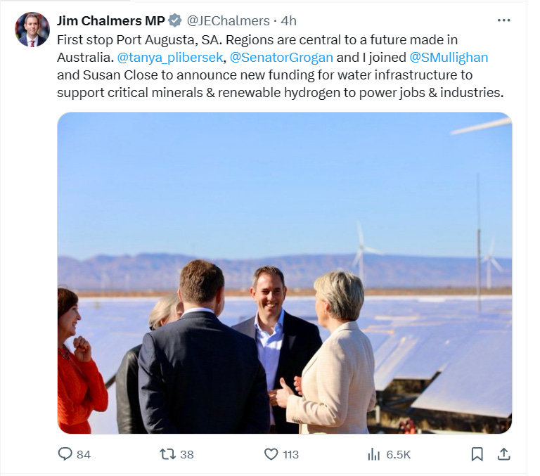 With parliament in recess for a week, Chalmers travelled to Port Augusta, South Australia, with environment minister Tanya Plibersek and SA state and federal colleagues to promote the government's Future Made in Australia renewable energy transition agenda.