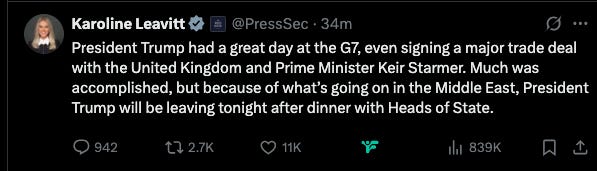 "Much was accomplished, but because of what's going on in the Middle East, President Trump will be leaving tonight after dinner with Heads of State," Leavitt wrote. She noted Trump had "a great day at the G7, even signing a major trade deal with the United Kingdom and Prime Minister Keir Starmer."