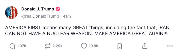 "AMERICA FIRST means many GREAT things, including the fact that, IRAN CAN NOT HAVE A NUCLEAR WEAPON," Trump wrote in one post.