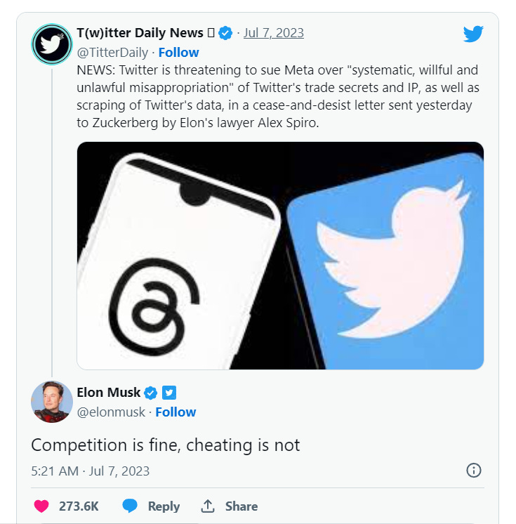 He also claimed that Meta gave those employees “Meta’s copycat ‘Threads’ app with the specific intent that they use Twitter’s trade secrets and other intellectual property in order to accelerate the development of Meta’s competing app, in violation of both state and federal law as well as those employees’ ongoing obligations to Twitter.”