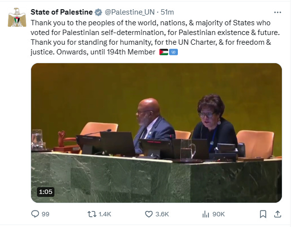 Palestinian Authority President Mahmoud Abbas applauded the UN General Assembly's overwhelming vote Friday in favor of the UN Security Council's reconsideration of Palestine's full UN membership.