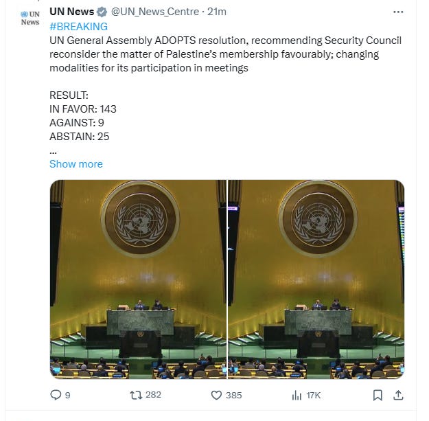 The most recent resolution also acts as a further reminder of the views held by a large portion of the global community regarding Palestine's eligibility for UN membership.