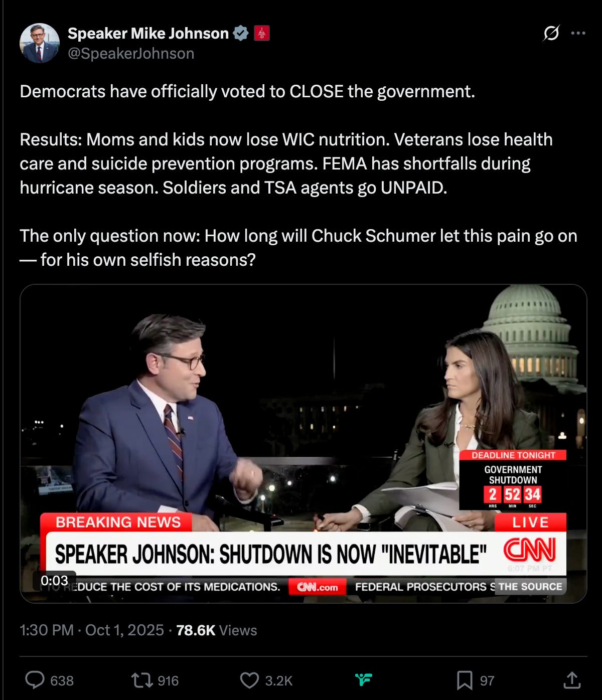 House Speaker Mike Johnson countered that assessment, declaring on the same platform: “Democrats have officially voted to CLOSE the government.”
