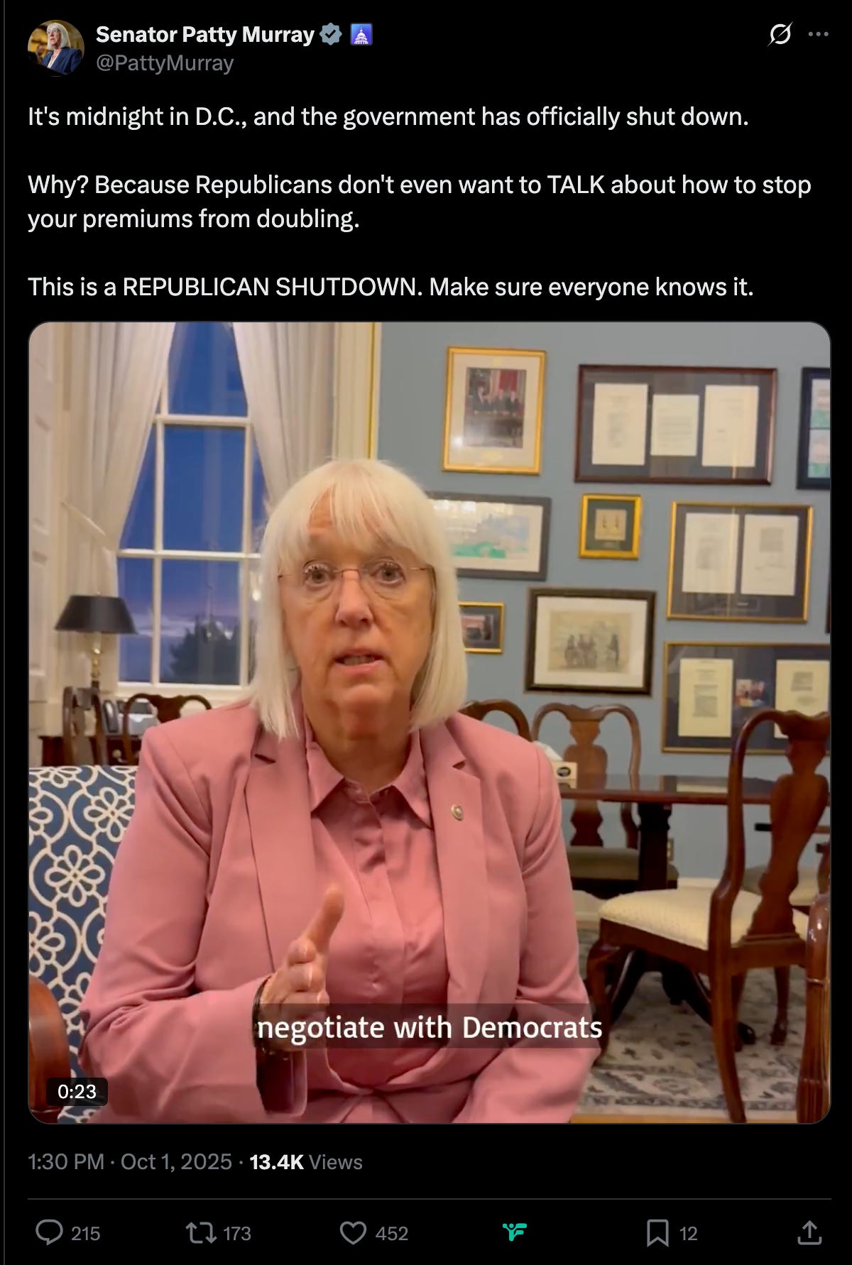 Sen. Patty Murray, vice chair of the Senate Appropriations Committee, said in a video from Capitol Hill: “Make no mistake, our government has shut down because Republicans refuse to negotiate with Democrats and do their job.”