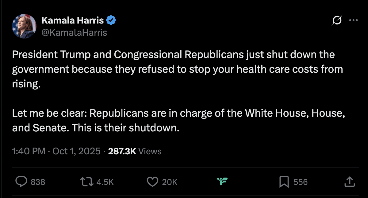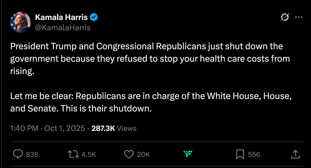 “Let me be clear: Republicans are in charge of the White House, House, and Senate. This is their shutdown,” former Vice President Kamala Harris said in a post on social media platform X.