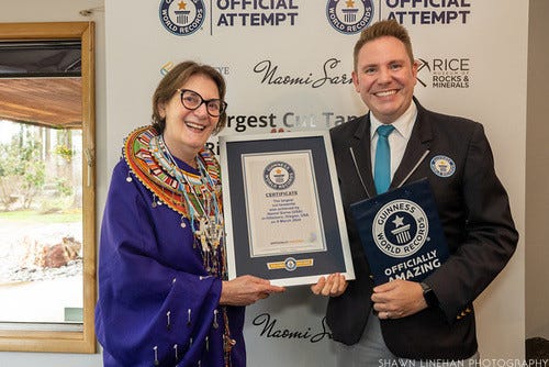 It was an exciting day at the Rice Northwest Museum of Rocks & Minerals, Hillsboro, Oregon, when artist Naomi Sarna's 703-carat L'Heure Bleu tanzanite carving set a GUINNESS WORLD RECORDS title as the world's largest cut tanzanite, on March 9.