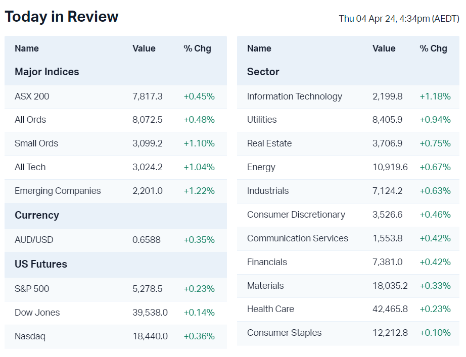 The S&P/ASX 200 closed 34.8 points higher, up 0.45%.
