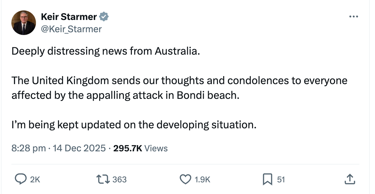 British Prime Minister Keir Starmer described the shooting as “deeply distressing,” posting on X that “the United Kingdom sends our thoughts and condolences to everyone affected by the appalling attack in Bondi Beach.”