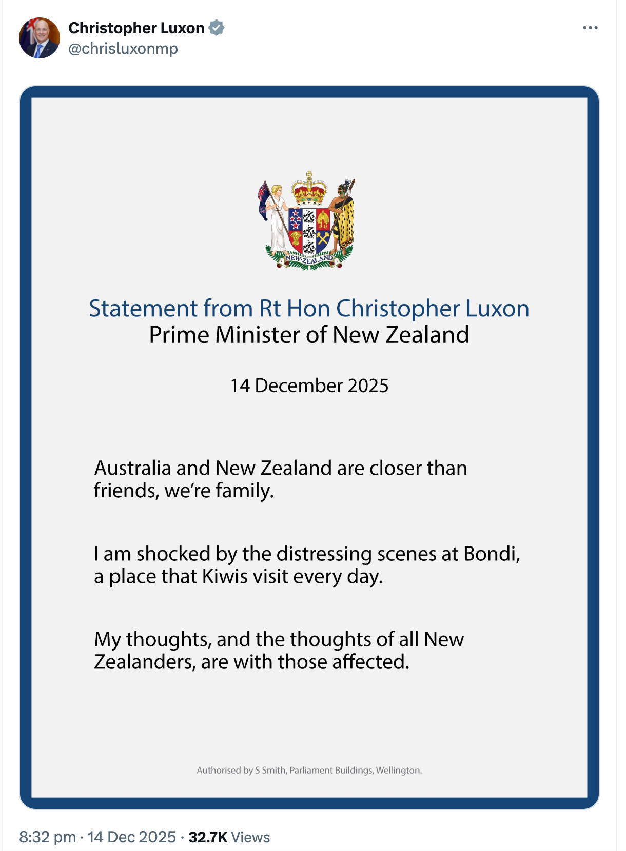 New Zealand Prime Minister Christopher Luxon said he was “shocked by the distressing scenes” at a location that New Zealanders visited regularly.